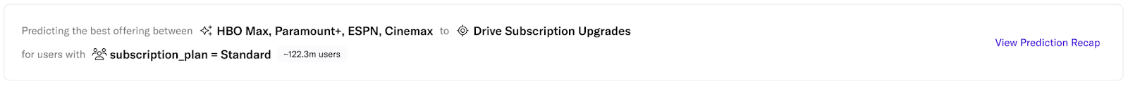 The Prediction Recap gives you a quick summary which actions or offers the prediction is choosing between, the business objective it is trying to drive, and the users that are eligible to receive an offer, including the current estimated number of users. Use the Prediction Recap to confirm that you are looking at the right combination of offers, business goal, and users before you review results or use the prediction to create new audiences.