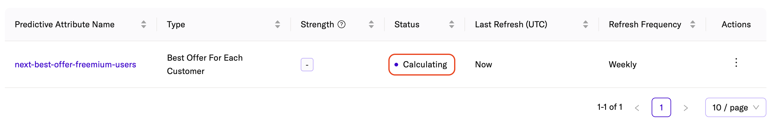 After creation, your new next best action prediction appears on the Predictive Attributes page with its current Quality and Status. While the prediction is still processing, its status displays as Calculating until mParticle has generated predictions for all eligible users.