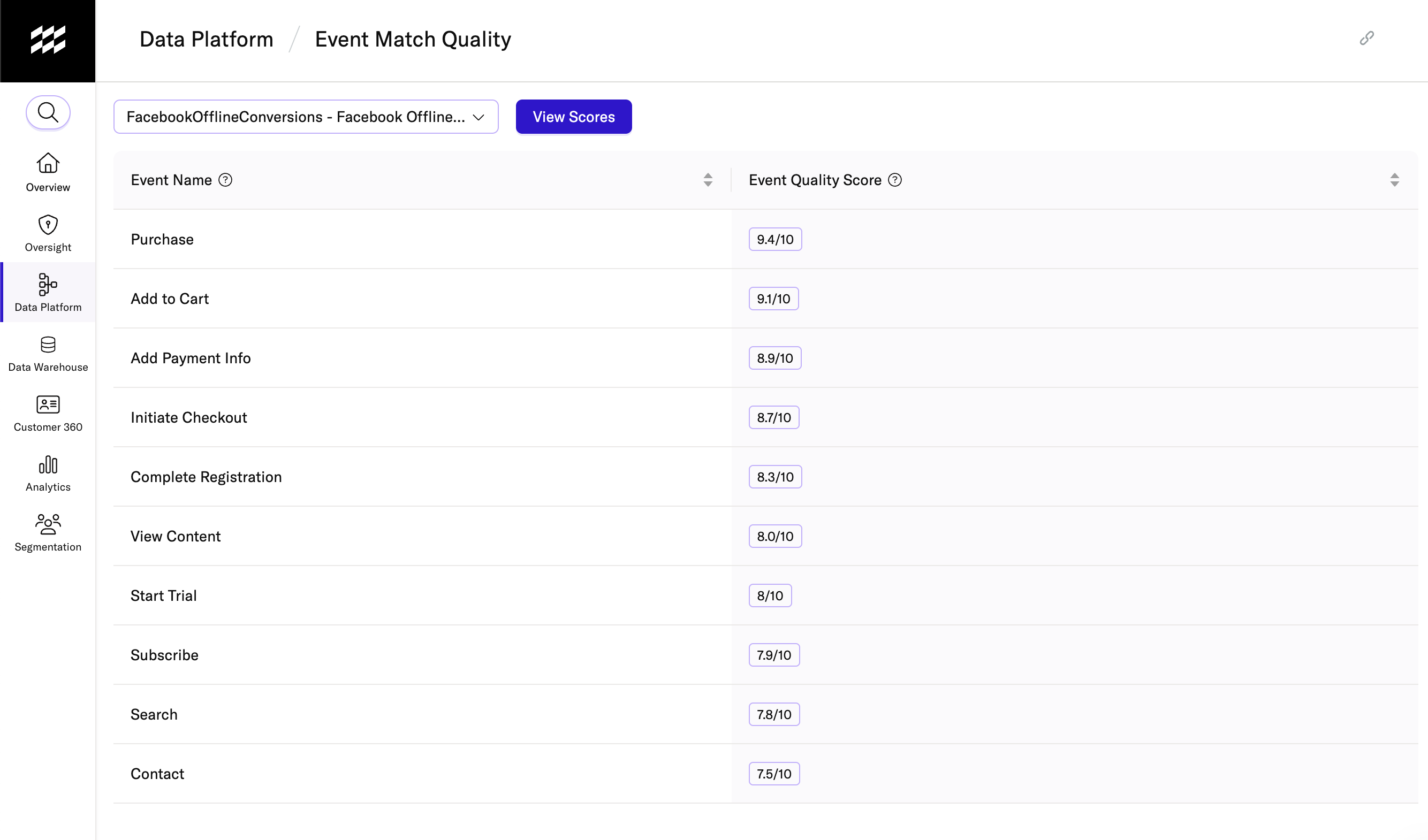 Once your Meta outputs have been configured to use a Conversions API access token that includes access to the Dataset Quality API, mParticle can retrieve and display EMQ scores when events are sent for those Meta datasets to Meta’s Conversions API.