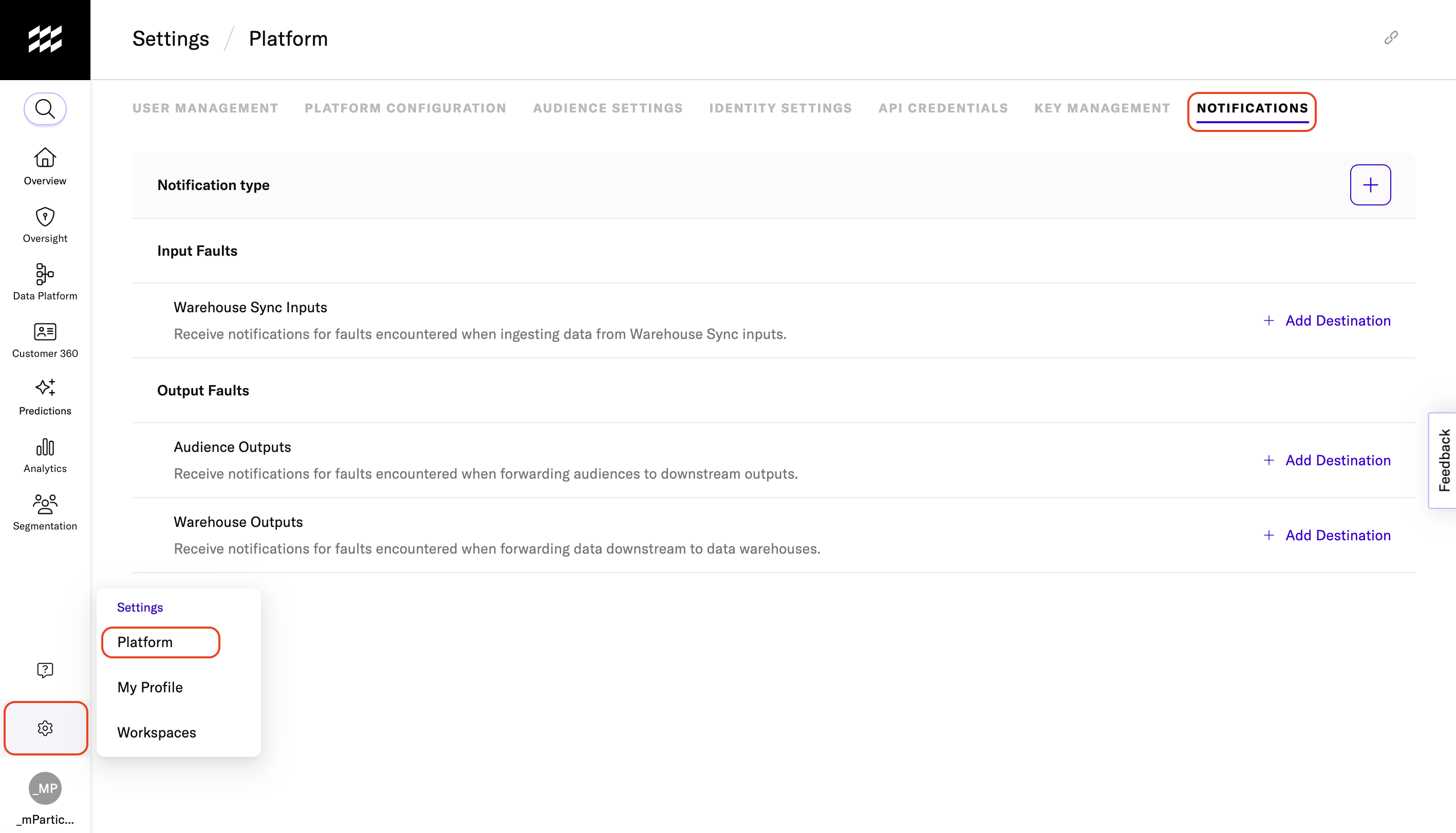Notification destinations are the channels where mParticle sends fault notifications. Supported destinations include email lists, Slack channels, and custom webhooks. Once a destination is created, you can enable or disable specific notification types for that destination from the Notifications settings page.