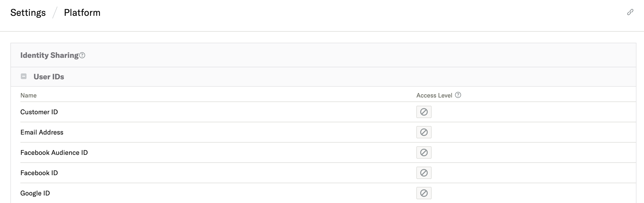 For example, you can choose to make Google Advertising ID and Apple IDFA available to a particular account, but keep email unavailable. These settings are applied at the account level and affect all audiences shared from that account. Identity filters only apply when a user hasn’t already been seen in the receiving account.
