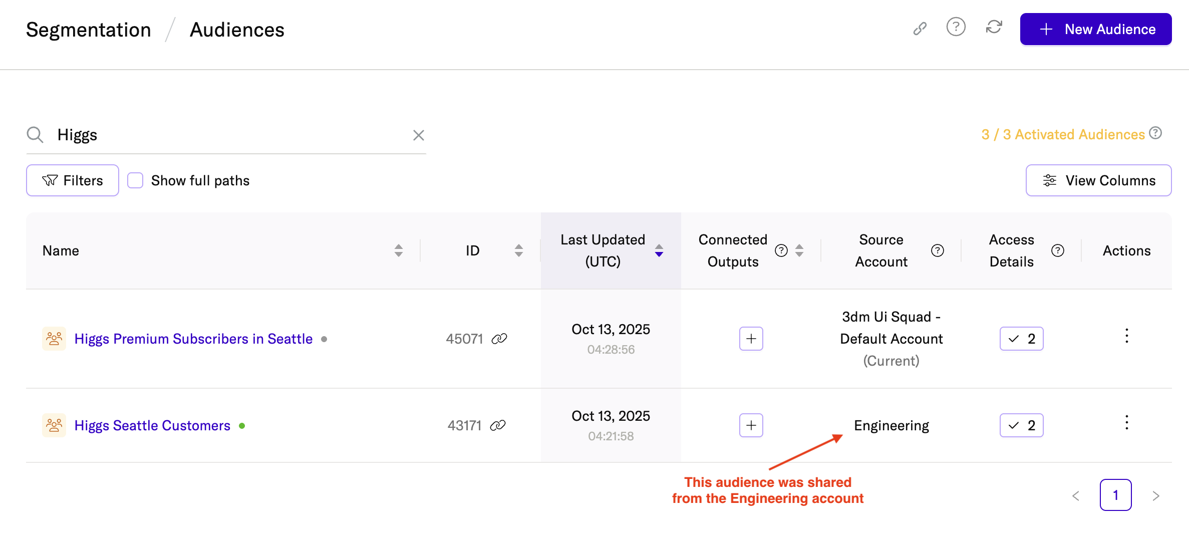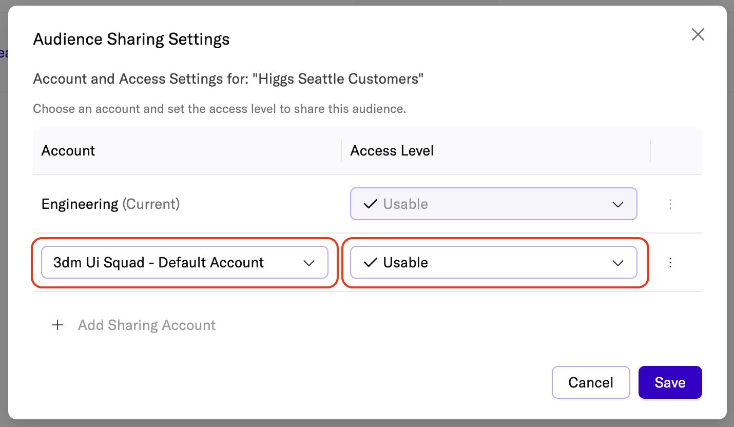Audience sharing allows you to grant different levels of access to audiences created in other accounts. For example, an organization that separates its global brand and regional locations into different accounts can use audience sharing to distribute audience definitions to different teams. The global marketing team might create a “High-Value Customers” audience based on purchase activity and engagement metrics, then share it with regional accounts.