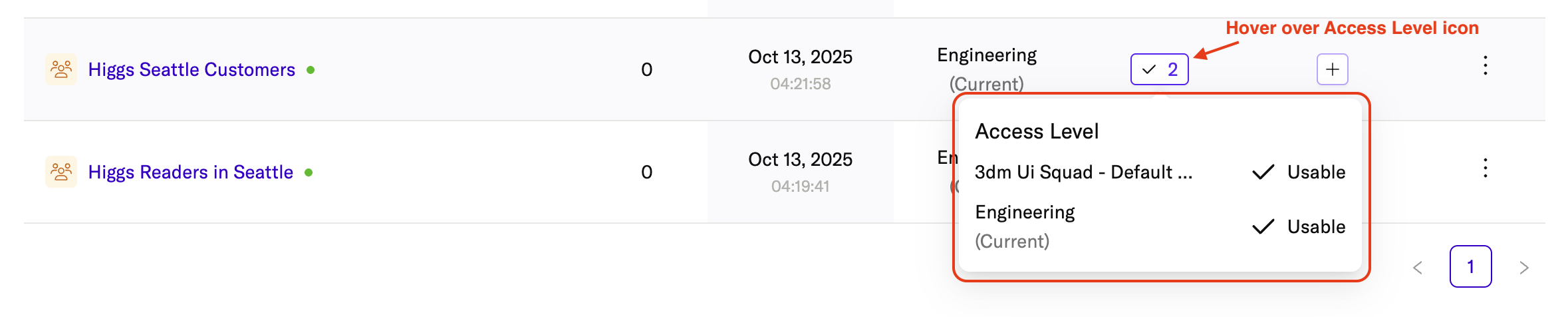 The Access Details column includes an icon for each audience that indicates how many accounts have access to the audience (this is represented by the number in the icon) and current account’s access level (represented by either a checkmark symbol or an eye).