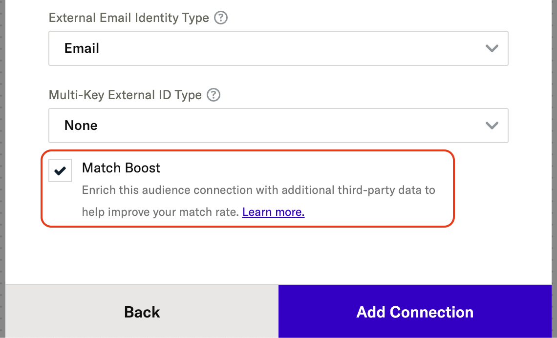 If you disable any identifiers in the audience connection settings, Match Boost cannot be enabled.